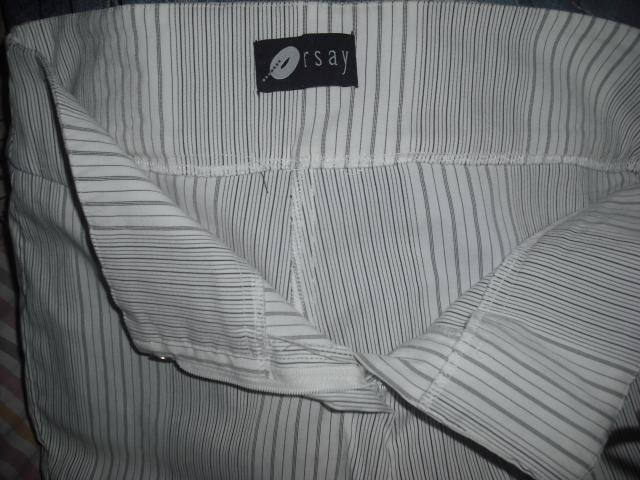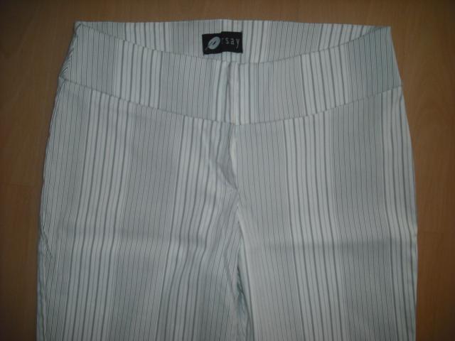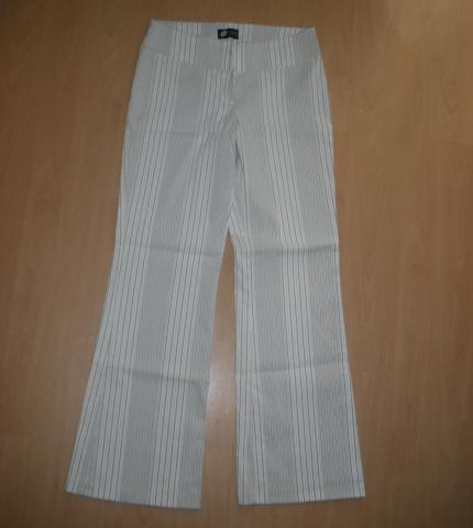 Vasariškos, baltos su išilginėm juodom linijom kelnės, maloni, tampri ir gražiai priglundanti medžiaga. Liemuo: 38-39cm; Klubai: 42 ir dar tempiasi; Nuo knyno į viršų: 22cm; Nuo klyno į apačią: 75cm; Porą kartų nešiotos, man jau per didelės.