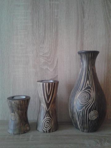 Medinis rinkinys: Vaza ir dvi žvakidės. Vaza šiek tiek įskilusi, todėl gyvų gėlių pamerkti neišeis. Bet džiovintų gėkių pokštė šioje vazoje atrodo tikrai puikiai.