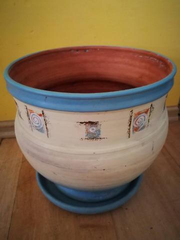Geros būklės molinis vazonas. Viršaus skersmuo - 30 cm, aukštis - 28 cm (su pagrindu, lėkštute - 29 cm).