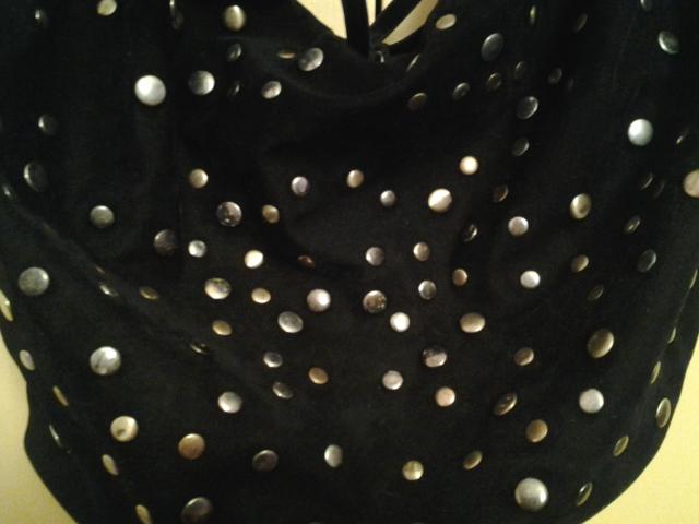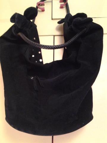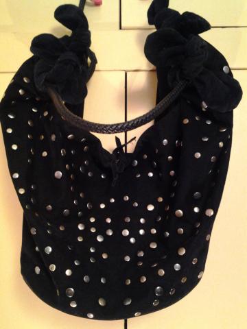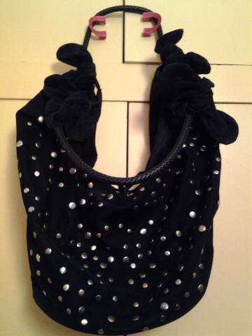 Išskirtinė,stilinga,įdomi,pusmėnulio formos veliūrinė rankinė papuošta spalvotomis, metalinėmis kniedėmis.Tvirta,standi,su tvirtomis, pintomis,lanksčiomis rankenomis,dugnas pakietintas,rankenų galai su surišamais kaspinėliais. Antra pusė be kniedžių,lygi juoda,su užtraukiamu skyreliu.Viduj yra nedidelis užtraukiamas skyrelis ir dvi kišenėlės.