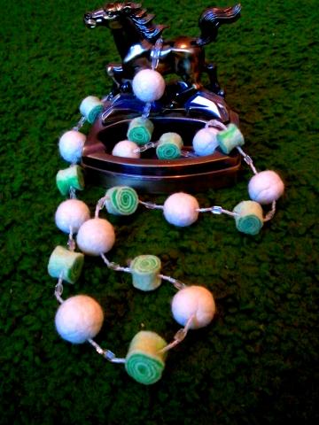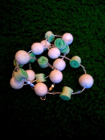 Veltinio karoliai, rankų darbo. Spalvos balta su žalia. Labai gražiai atrodo prie šviesių, pastelinių spalvų drabužių.