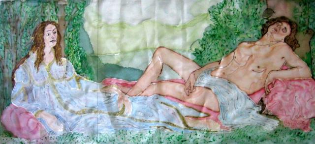 Tapyba ant šilko. Paveikslas įremintas, 77x35 cm. Pavaizduotas graikų dievas Marsas ir deivė Venera. Kaina 350 Lt.