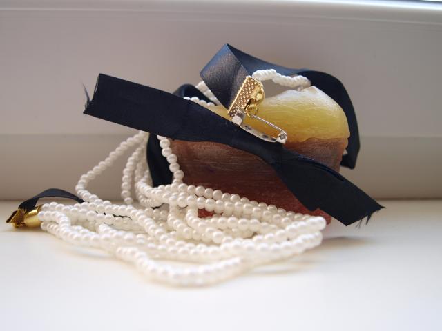 Vėrinys ant kaklo su kaspinėliu ir perliuko imitacijoms.