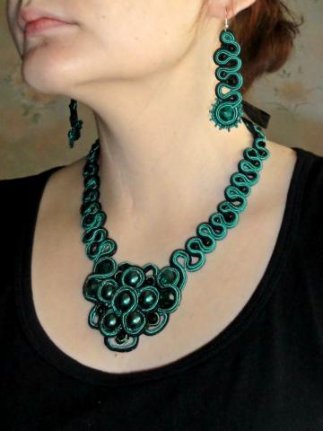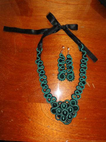 Rankų darbo sutažo ir karoliukų vėrinys bei derantys auskarai.