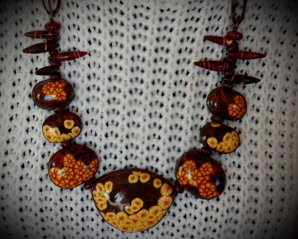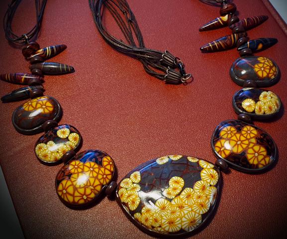 Vėrinys iš kolekcijos "Millefiori dance". Padirbtas iš polimerinio molio, nauduojant "millefiori" techniką. Autorinis dizainas. Ilgis apie 75cm, centrinė detalė - 7x6cm. Puošnus, tačiau skirtas kasdieniniam nešiojimui.