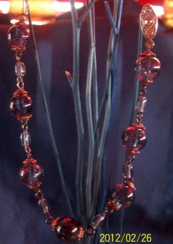 Verinys, 44cm ilgio juodinto metalo dalys, uzsegimas uzsukamas, 8mm dauzto stiklo karoliukai, biseris, 4mm juodi kristalai, tamsiai violetiniai 6mm kates akys, duminio kvarco skalda. Kaina 30lt