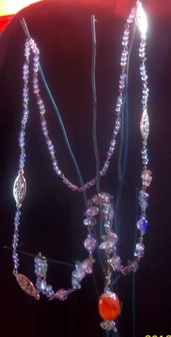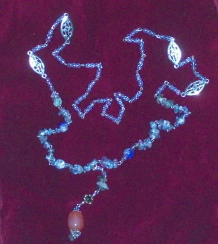 Verinys, ilgis be pakabuko 78cm, pakuboko ilgis 8cm, intarpai tibeto sidabro, 4mm melsvi kristalai, 8mm dauzto stiklo karoliukai, stiklo skalda. Pakabukas, 8mm pilkas kristalas, 4mm melsvas kristalas, juodo akmens skalda, pasidabruotos kepureles 12mm plastikinis karoliukas. Kaina su pakabuku 45lt be 40t