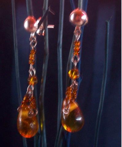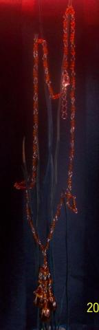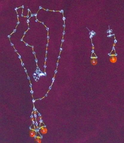 Verinys, ilgis 45cm, prailgintojas 3,5cm, metalizuotos detales, padarytas is juvelyrinio gintaro, 4mm kristalai, laseliu ilgis 1,5cm, auskarai pasidabruoti vinukai, auskaru ilgis 3,5cm is juvelyrinio gintaro galima ir iskomplektuoti. Kaina komplekto 50lt, verinio kaina 30 lt auskaru 20 lt