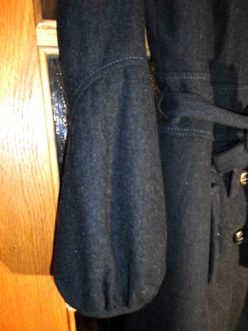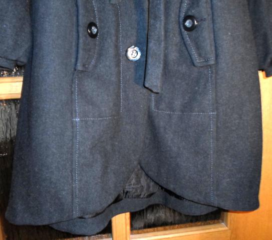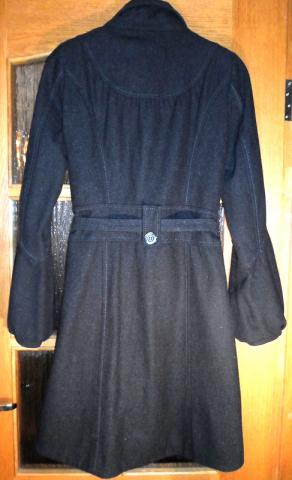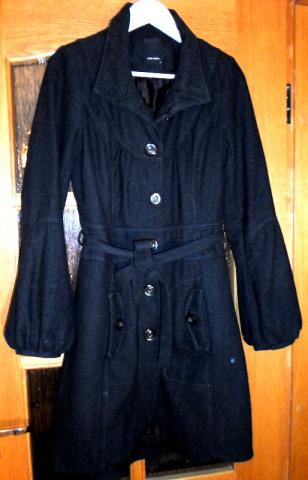 Tamsiai pilkos spalvos. Iki kelių. Pūstos rankovės. Palto apatinė dalis nelygi - nugaros dalis šiek tiek ilgesnė už priekinę. Stilingas. 36 dydis.