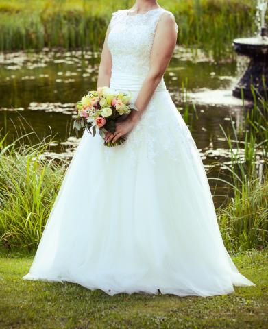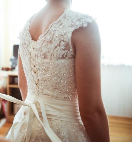 Suknelė pilnai išvalyta, dėvėta vieną kartą Dramblio kaulo spalvos Viršus siuvinėtas karoliukais ir žvyneliais Apatinė suknelės dalis (viršuje) irgi siuvinėta karoliukais ir žvyneliais Nugara suvarstoma, tad suknelės dydis reguliuojamas 38-40 dydis 173 cm ūgiui, su kulniukais ~8 cm suknelė bus iki žemės Ties juosmeniu atlasinė juosta Dėl kainos galima derėtis