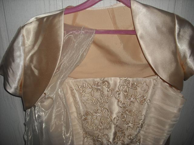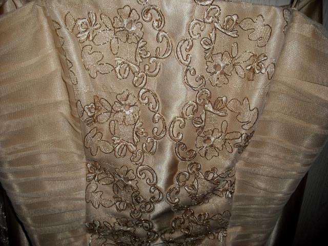 Tik kartą dėvėta proginė-vestuvinė suknelė, susidedanti iš 3 dalių: sijono, korseto, suvarstomo nugaroje bei švarkelio. Yra kaspinas, kurį galite rišti į plaukus ar ant puokštės. Mano kataloge yra ir batukai, pritaikyti prie šios suknelės, kurių kaina 30lt. Išmatavimai: švarkelio ilgis matuojant nuo nugaros: 32cm korsetas per krūtinę: reguliuojamas, nes suvarstomas nugaroje: nuo 72cm iki 90cm korseto ilgis nuo pažasties: 27cm juosmuo: 68cm sijono ilgis: 108cm