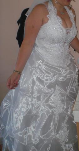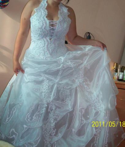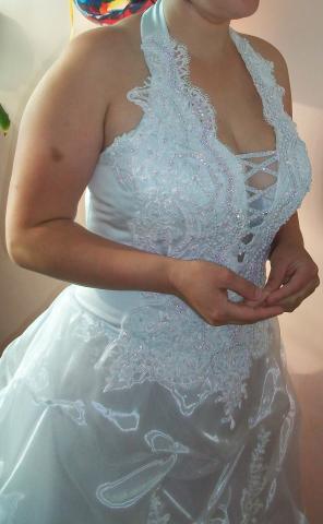 Dailiai išsiuvinėta karoliukais ties krūtine ir liemeniu. Suvarstoma iš nugaros, todėl krūtinės, liemens ir klubų apimtys lengvai reguliuojamos. Tiktų ir nėštukėms ir stambesnioms panelėms. Taip pat ir lieknoms. Dėvėta tik vieną kartą. Po naudojimo išvalyta ir sutvarkyta. Prie suknelės pridedamas nuometas ir pasijonis su lanku (viskas parduodama kartu su saugojimo maišu). Galiu išnuomoti už 200lt.