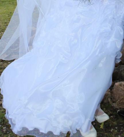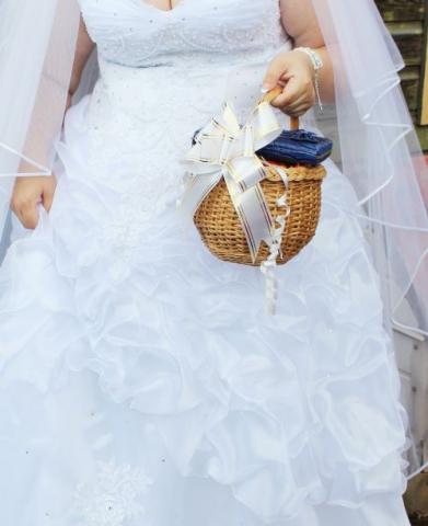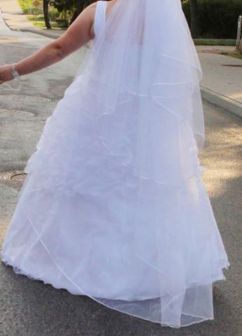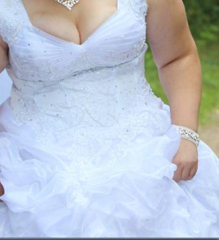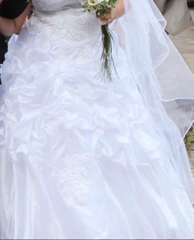 Parduodu vieną kartą dėvėtą vestuvinę suknelę. Sniego baltumo . Pirkta salone pagal užsakymą. Dovanų pridedu ilgą trijų sluoksnių nuometą. Suknelė yra tvarkinga.(išvalyta ir išlyginta). Suknelė didelio dydžio, gale varstoma raišteliais, tad galima reguliuoti-mazinti ar didinti