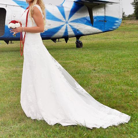 Ivory spalvos vestuvinė suknelė. Vieną kartą dėvėta. Suknelė skirta aukštoms panelėms (apie 185cm) ilgas šleifas (dėl patogumo gali būti prisegtas prie pasijonio). Papildomai yra ilgas nuometas. Esant poreikiui yra vestuviniai bateliai (41dydis) ir natūralaus kailio bolero. Suknelė atrodo išties išskirtinai Suknelė gali būti ir nuomojama, kaina 1000lt