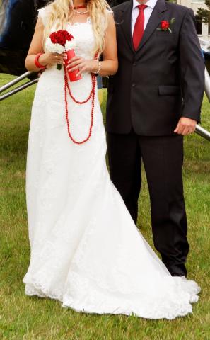 Ivory spalvos vestuvinė suknelė. Vieną kartą dėvėta. Suknelė skirta aukštoms panelėms (apie 185cm) ilgas šleifas (dėl patogumo gali būti prisegtas prie pasijonio). Papildomai yra ilgas nuometas. Esant poreikiui yra vestuviniai bateliai (41dydis) ir natūralaus kailio bolero. Suknelė atrodo išties išskirtinai Suknelė gali būti ir nuomojama, kaina 1000lt