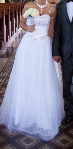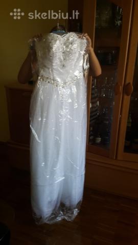 Parduodu nauja vestuvine suknele. Deveta tik viena karta.Iskarto padarytas valymas. Nuotraukoje jos tikrasis grozis neatsispindi. Visa su blizgesiu. Galas susivarsto todel galima ir pasiaurinti ir paplatinti kiek reikia. Tinka nesiojancioms drabuzius nuo 8 iki 22 dydzio ( UK dydziu lentele). Dar pridedu kartu ir veliuma.