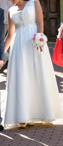 Sveiki,mano gražioji suknelė ieško naujos šeimininkės. Pirkta nauja, pieno baltumo, dydis tiks nuo M iki XL, kadangi nugaroje suvarstoma ir lengvai prisitaikys prie kiekvienos figūros. Suknelė netrumpinta, mano ūgis 173 cm plius bateliai 5cm. Tikrai labai patogi,nevaržo judesių ir labai gražiai krinta. Susideda iš trijų sluoksnių (pamušalas, pakietinta medžiaga ir viršutinis sluoksnis). Gale yra juostos lyg sparnai :) labai gražiai galima panaudoti nuotraukose.