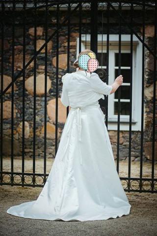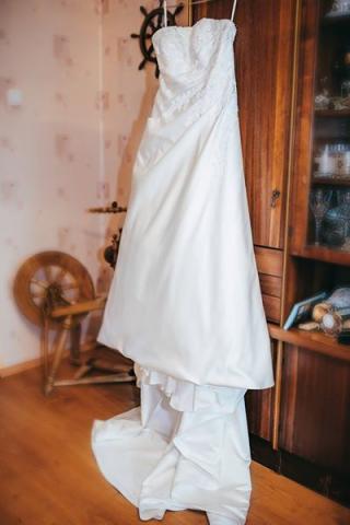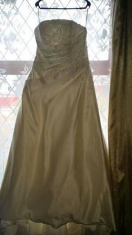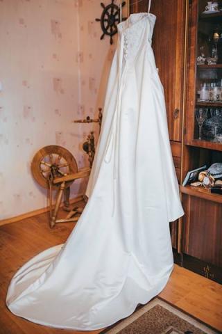 Parduodu savo vestuvine suknele. Suknele yra dramblio kaulo spalvos kitaip vadinama ivory spalva.suknele labai patogi. Nugaroje yra uztrauktukas ir tai pat varstosi raisteliais. Turi ilga sleifa. Suknele isvalyta. Dydis nuo 44 iki 46 . Ugis gali buti nuo 165 iki 170 . Mano buvo 170cm. Pridedu bolero svarkeli.(reikia issivalyti)