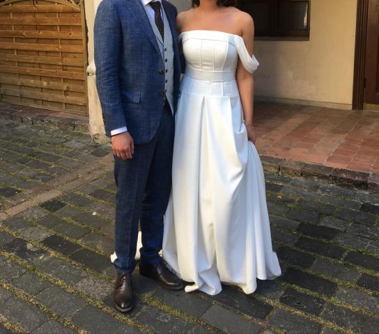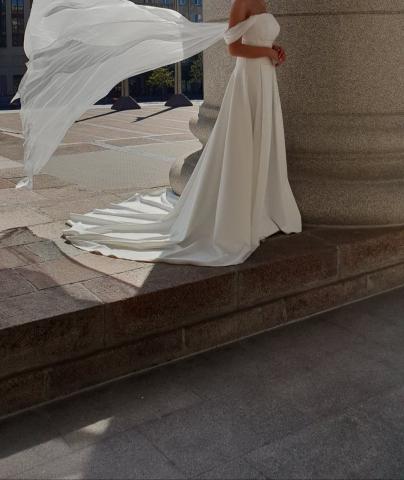 Dizainerio E. Rainio klasikinė vestuvinė suknelė, kainavo 1200eur, siūta 2018 metais. Dėvėta vieną kartą, visiškai nauja. Esu 1.69cm ūgio, dėvėjau 9cm aukštakulnius. Jei reiktų daugiau nuotraukų, išmatavimų, atba norėtumėte ją pasimatuoti, kreipkitės.