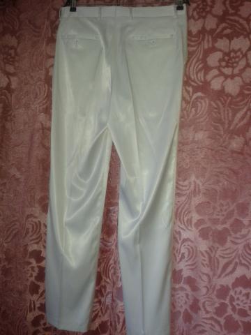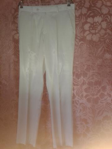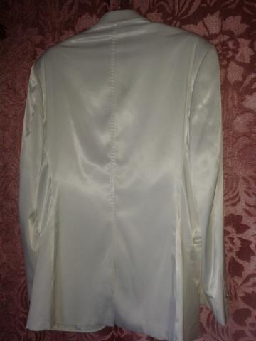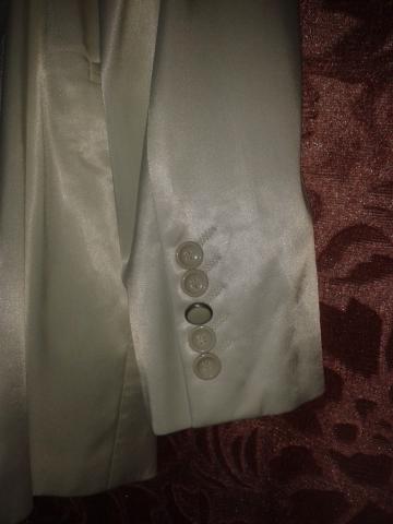 Parduodamas viena karta devetas,baltos spalvos vestuvinis kostiumas.Dydis L/50.Bukle labai gera.kelniu ilgis-113cm,juosmens apimtis -90cm.Peciu plotis 52cm,rankoviu ilgis-67cm,viso svarko ilgis-82cm.Kostiumas tinka ~ 187-190 cm ugiui.Sudetis 60%laine,40%polyester.