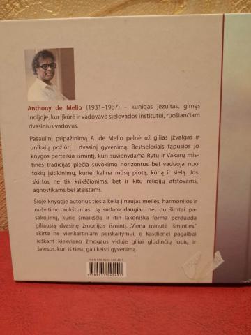 2009m.Anthony de Mello, Šioje knygoje autorius tiesia kelią į naujas meilės, harmonijos ir nušvitimo aukštumas. Ją sudaro daugiau nei du šimtai pasakojimų, kurie šmaikščia ir itin lakoniška forma perduoda giliausią dvasinę žmonijos išmintį. „Viena minutė išminties“ skirta ne vienkartiniam perskaitymui, o kasdienei pagalbai ieškant kiekvieno žmogaus viduje giliai glūdinčių lobių ir šviesos, kuri iš tiesų gali keisti mūsų gyvenimą.