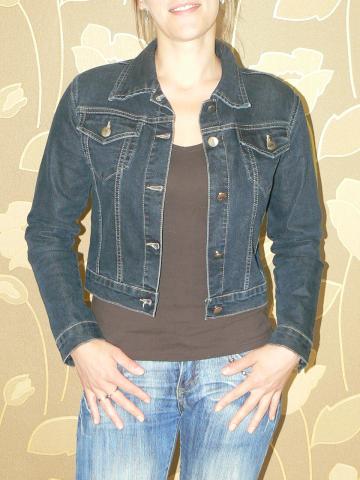 S dydžio moteriškas tamsaus džinso švarkelis.