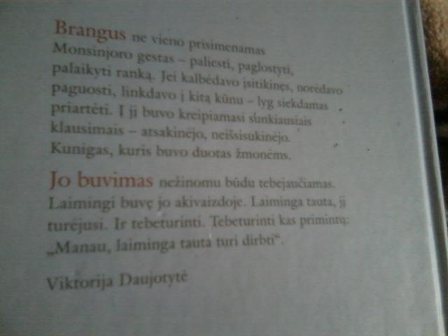 Žymios literatūros tyrinėtojos knygoje atsiskleidžia monsinjoro Kazimiero Vasiliausko (1922– 2001) gyvenimas ir likimas, kunigo ir žmogaus didieji dvasios darbai, pažiūros, jų biografinės ir literatūrinės ištakos. Kartu ir jo kartos. Monsinjoro laiškai, pamokslai, žmonių prisiminimai ir vertinimai, asmeniško bendravimo patirtis yra ryškios asmenybės literatūrinio atvaizdo kūrimo šaltiniai.