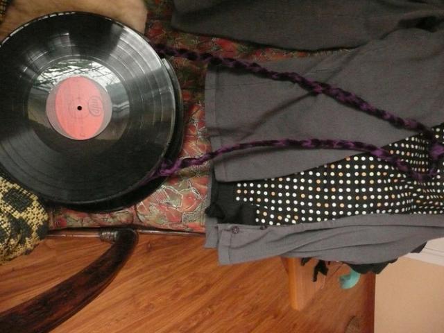 viniline tase,bliuze pilka, taškuota maike ir vėr