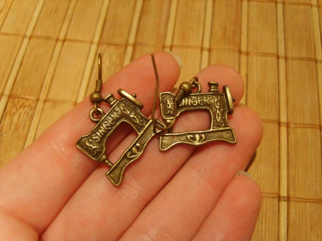 Vario spalvos smagūs auskarai su senovine siuvimo mašinyte Singer.