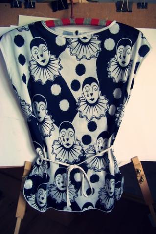 100% polyester. Juoda balta. Apacioj prisiutas raistelis, susirisa. Dydis pakankamai universalus.