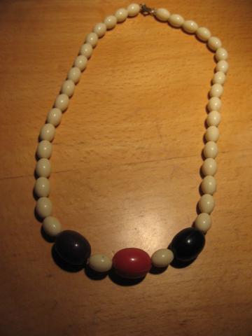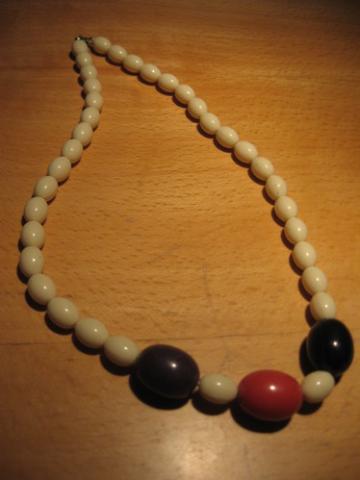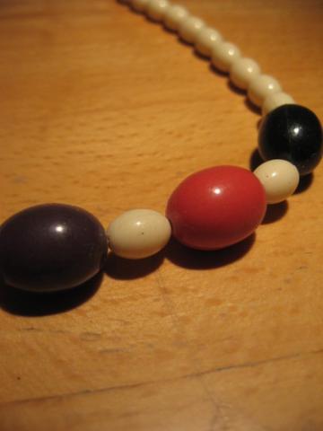 Mieli, mamos laikus menantys karoliai. Patys balti, o viduryje esantys trys ryškesni skirtingi: violetinis, raudonas ir juodas. Kaip nuotraukoj :)