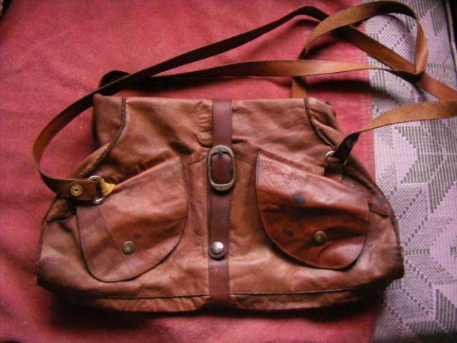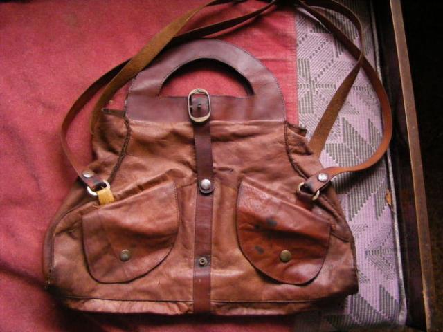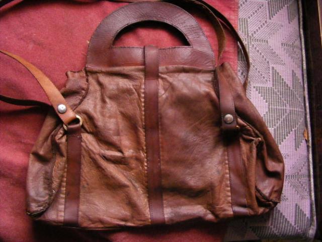 Odinė, galima nešiot sudėjus trumpas rankenas vidun, užsisega dirželiu. Viduj zomšinė. Na, gan sena, viskas matoma nuotraukose