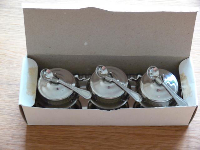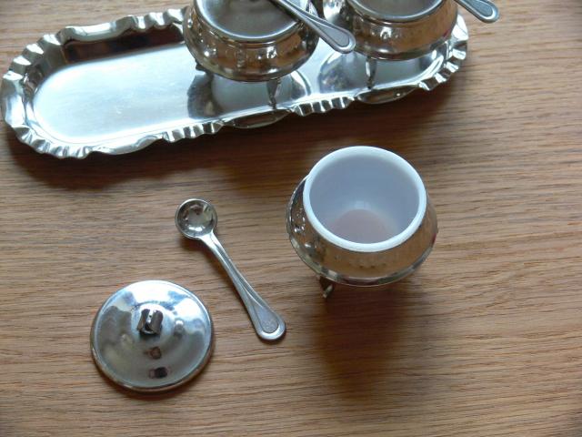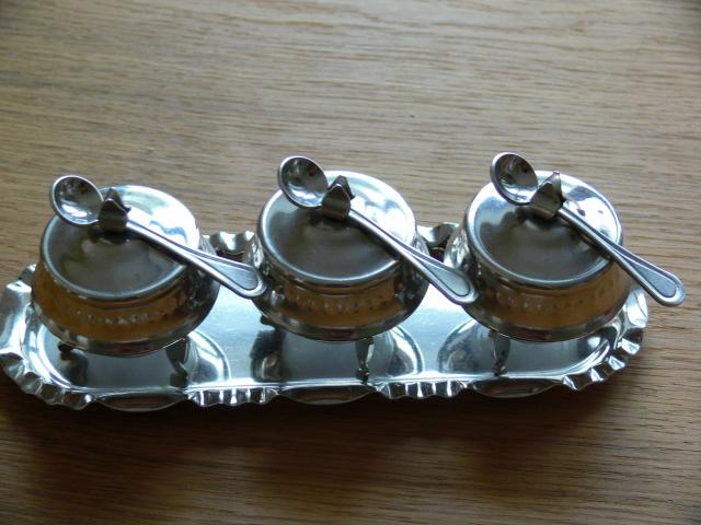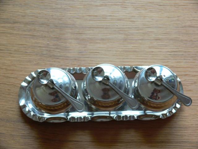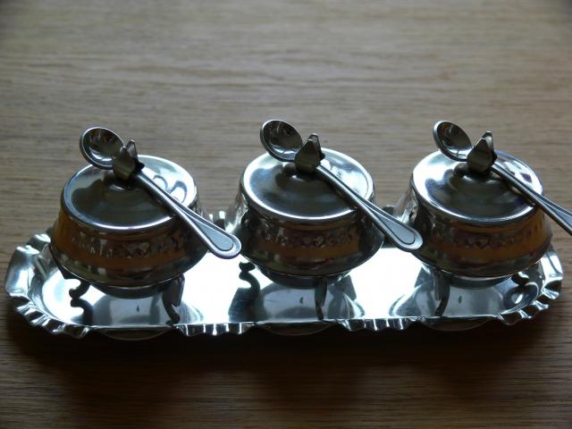 Likęs iš senų laikų, nė karto nenaudotas. Trys indeliai su mažučiais šaukšteliais, sustatyti ant padėklo. Padėkliuko ilgis - 18 cm. (c)