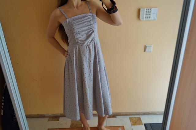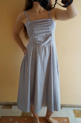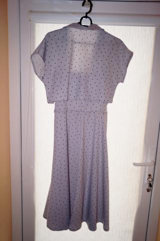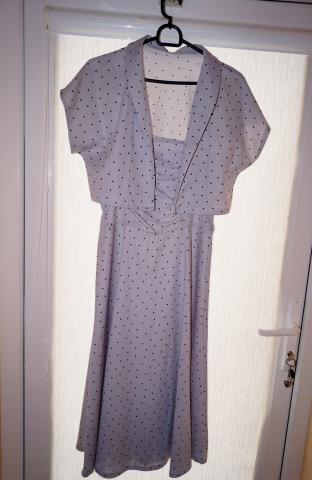 siūta suknelė, be defektų, su bolero, visas ilgis nuo petnešėlių viršaus 112 cm, ties pažastimis apimtis 42,5x2 cm, ties įliemenavimu, kuris gerokai paaukštintas - 38x2 cm, parauktos dalies ilgis 25 cm. Dydis, manau M.