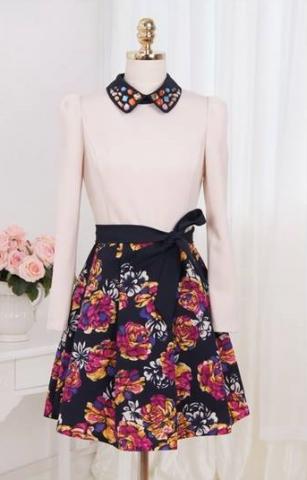 Nauja, puosni vintazinio stiliaus suknele, sujuosiama melynu dirzeliu, dekoruota apykakle, flisuotas geletas sijonukas, 3/4 rankoves. Dydis M.