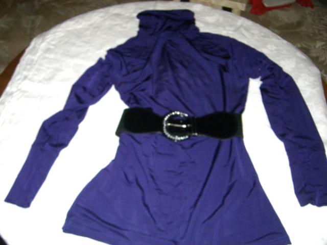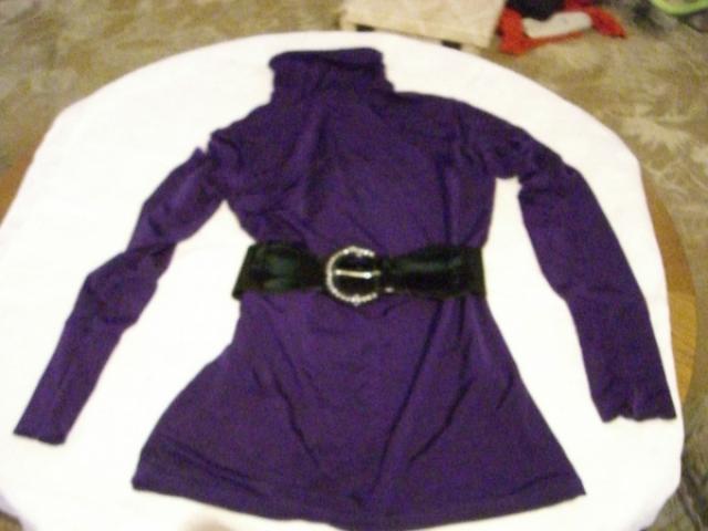Violetinė ilga golfytė. Tokios lyg ir slidžios medžiagytės :} Fotografavau nespalvotai, nes kažko fotoaparatas neatpažysta violetinės spalvos. Gaunasi mėlyna. Įmesiu nuorodą spalvos kokia ji yra reali. Be defektų. http://server2.manodrabuziai.lt/images/item_photos/00336/86497/Nuotrauka1856_thumb130.jpg?1309181858