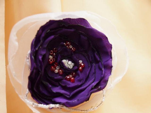 Violetinė organzos sagė su raudonais karoliukais. Rankų darbo. Galiu siųsti į kitus miestus.