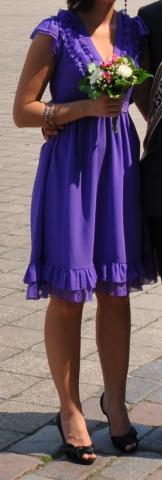 Violetinė suknelė, dėvėta kelis kartus,firma next. Desineje puseje ties juosta ir po ja yra keletas isispesusiu siuliuku,kurie nematyti jei nezinai ir be to suknele krenta klostemis. Priekis trikmapio formos ,nugaroje susirisa virsuje ,taip pat ties limeniu risasi irgi. Dydis 8 angliskas,bet as nesioju 10 ir tinka man, be to ir M dydziui tiktu. jei dar kyla kokiu klausimu rasykite