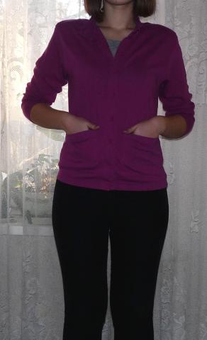 Paprastas bet neprastas megztukas, tokios rožinės-violetinės spalvos. Realiai jis truputį šviesesnis :) yra petukai, aišku, juos galima nuardyti, bet kažkaip jie suteikia truputėlį unikalumo :) Nėra jokių defektų.