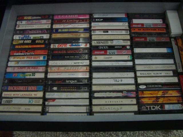Turiu 135 audio kasetes. Yra 9 originalios lietuviškos kasetės. Didesnė dalis yra namų salygomis įrašytos. Sarašiukas: Panasonic - 2, LG - 2, Goldstar - 2, Maxell - 12, Sony - 7, TDK - 11, BASF - 10, Fuji - 6, JVC - 3, SNC - 3, AMS - 1, ECP - 1, Philips - 1, Master - 1, Toyota - 1, Denon - 1, Magnetic Sound - 3, rusiškos - 4, nenustatyto gamintojo - 27, pirktos su įrašais (dalis originalios, dalis ne) - 34.