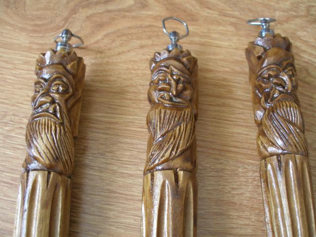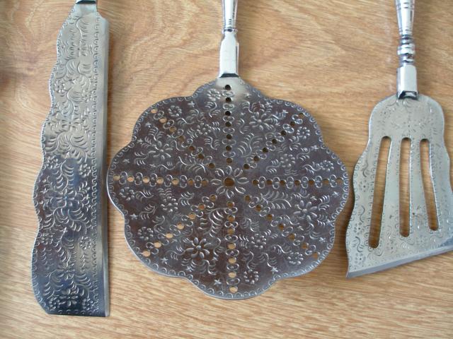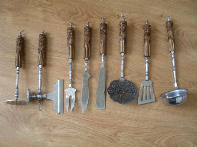 Grazus irankiu komplektas, tinkantis i vasarnami, sodyba, jaukius namus. Irankiu rankenose drozineti velniai, ant kiekvieno irankio skirtingi. Komplektas naujas.