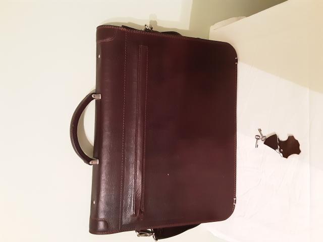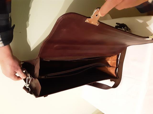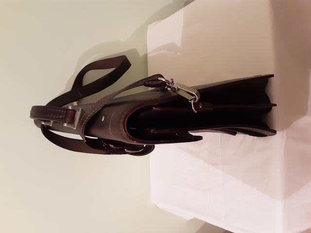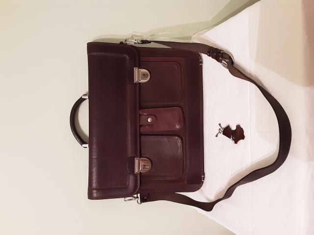 Parduodu visai naują, nenaudotą vintage vyrišką natūralios odos rudos šokolado spalvos portfelį. Horizontalus plotis 45 cm, vertikalus plotis 35 cm. Yra odinis reguliuojamas diržas, kuris prie korpuso tvirtinamas dviem labai patvariais karabinais.Viduje du atviri skyriai ir 2 secret užtrauktukais užsegamos dalys. Viena ištisiniu užtrauktuku užsegama secret kišenė yra anfas dalyje. Priekyje yra 3 kišenės rašikliams, kalkuliatoriui, arba telefonui, viduje taip pat yra nedidelė kišenėlė. Portfelis rakinamas -