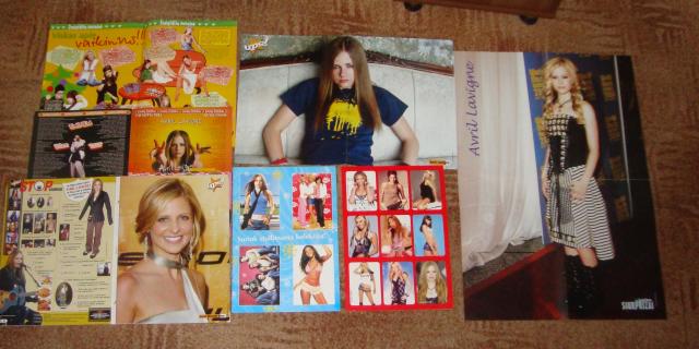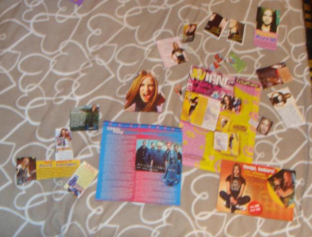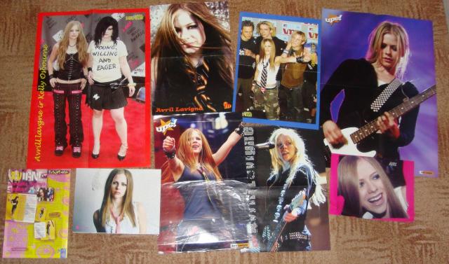 Avril iškarpos, plakatai (1,2 ir 4 A4 formato lapų) bei 5 žurnalai (žvaigždyno siurprizai, ups, top of the pops) bei kalendoriukas ir atvirutė, kurios kitoj pusėj yra Avril dainos tekstas