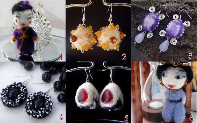 1.Pakabukas telefonui "Japoniukė". 2.Auskariukai apie 3cm.(veltinis,stikliniai karoliukai,met.detalės) 3.Auskariukai apie 5cm(veltinis,stiklinis lašelis,met.detalės) 4.Auskarai"Juodieji serbentai"(veltinis,agatas,biseris,met.detalės)REZERVUOTA 5.Auskarai "iglu"(veltinis,stiklas,metalinės detalės). 6.Pakabukas telefonui"Jasmine".