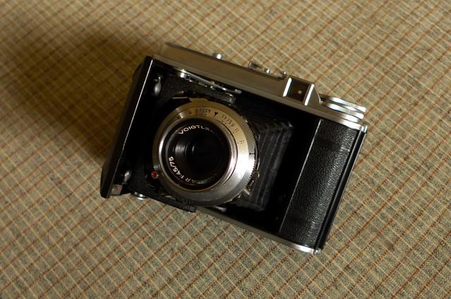Voigtlander Perkeo I, objektyvas Voigtlander 1:4,5/75. Išlaikymai 1/25-1/200, B. Vidutinis formtas, 6x6. Būklė labai gera, veikiantis, su dėklu.