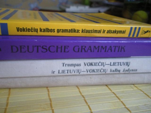 LIko Trumpas vokiečių - lietuvių ir lietuvių - vokiečių kalbų žodynas; 'Vokiečių kalbos gramatika' - nuotraukoje dvi apatinės knygos