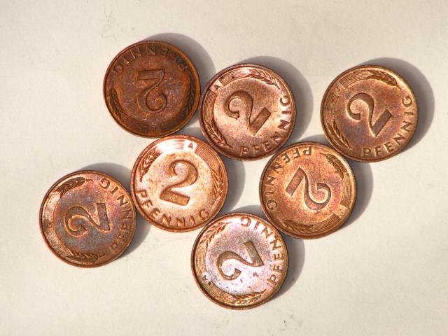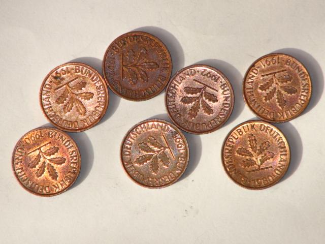 1 pfennig - 1971, 1977, 1982, 1983, 1984, 1991,1994 ir 1995. 2 pfennig - 1980, 1990, 1991, 1991, 1992, 1992 ir 1995.