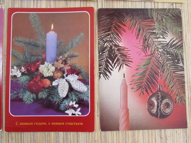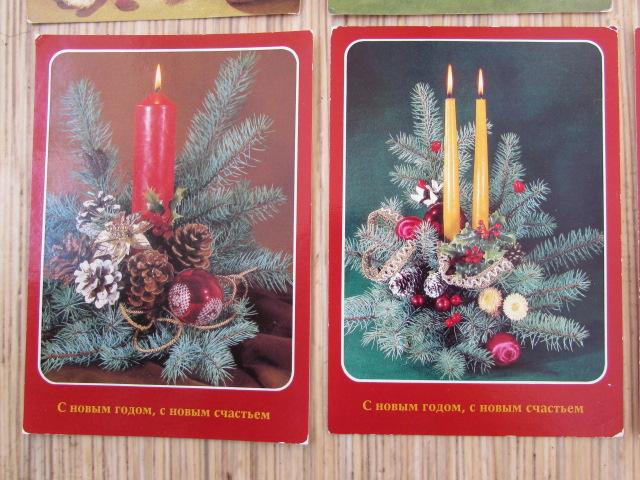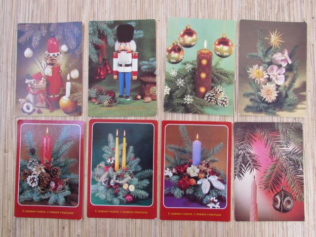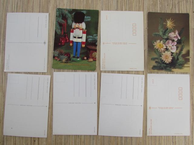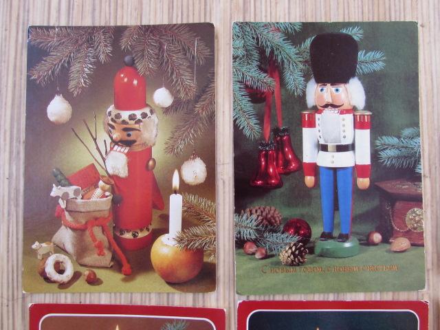 DDR vokiškos naujametinės kalėdinės atvirutės, išleistos sovietmečiu. Žaisliukas - kareivis, eglutės žaisliukai, žvakės, eglės šakelės, orchidėja, senis šaltis, dovanos, kankorėžiai. Naujos, bet kampeliai kiek pasitrynę. Dvi - su užrašais. Vienos atvirutės kaina - 0.30 euro.