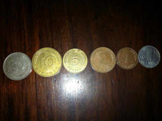 50pfenning-1992metu, 10-1990m, 5-1994m, 2-1980m, 1pfenning(deutsche demokratische) - 1968metu.