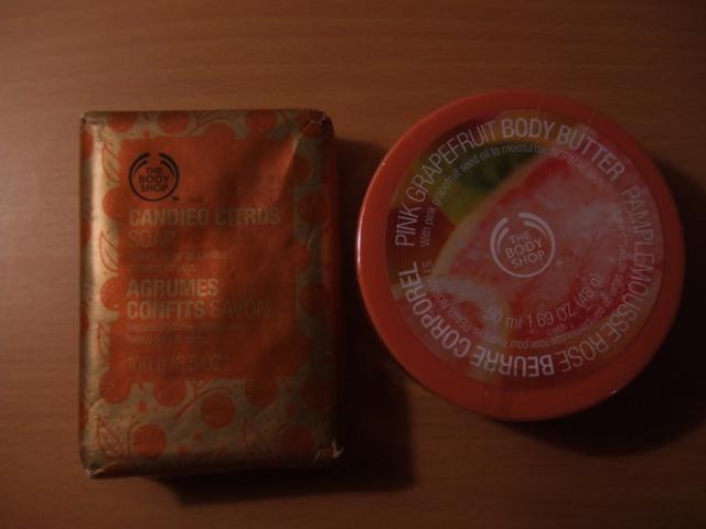Body shop muiliukas (apelisinu kvapo) ir kuno sviestas (greifurtu kvapo). Nei vienas nepraplestas. (Sviestas ismainytas)
